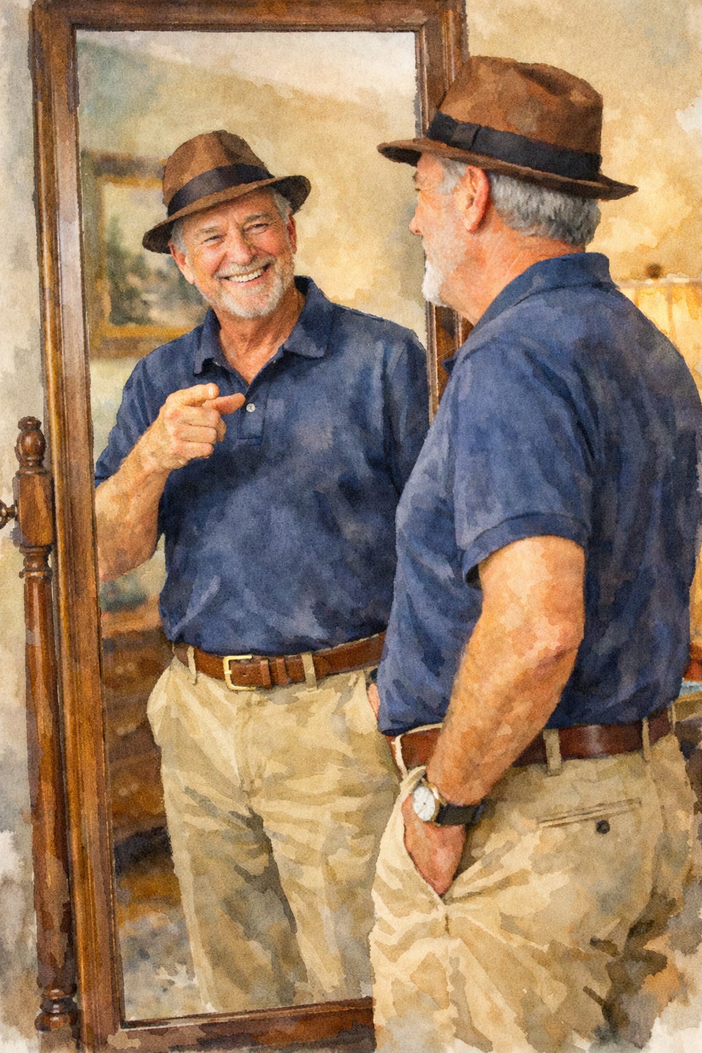 The house is quiet. Angie’s getting groceries. Be back in an hour. I’m in the hallway. Walking past the mirror. The full-length one. I stop. Look. Guy in his sixties. Gray hair. Navy polo. Standing in his own house.